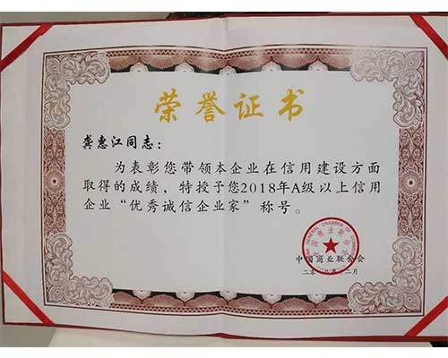 热烈祝贺董事长龚惠江先生荣获“优秀诚信企业家”称号