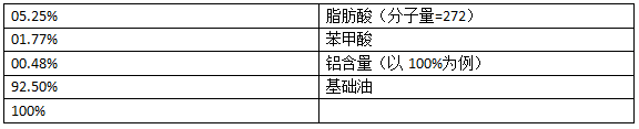 基础油为650SUS,其苯胺点为99℃,皂含量为7.5%,苯甲酸和脂肪酸的摩尔比为0.75,总酸与总铝的摩尔比为1.9,该配方可描述如下: