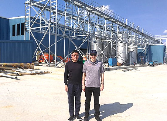参观产能5万吨的酯油(新建)工厂后棋成集团董事长龚惠江(左)与司马化学美国公司销售总监Tyler(右)亲切合影