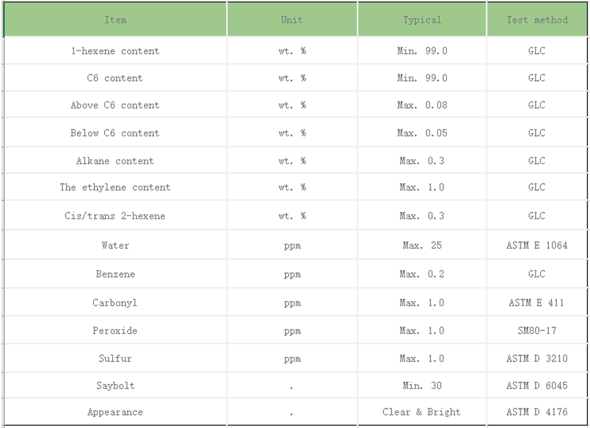 1,PE,PP: As the copolymerized monomer of LLDPE, HDPE, PP and other plastics, this product can obtain a better performance than using 1-butene as the copolymerized monomer.